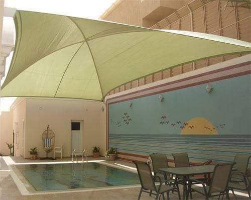 مظلات المسابح من شركة فجر الفضي تتجاوز مجرد وظيفة الحماية إلى تحويل المساحة حول المسبح إلى مكان جميل ومريح